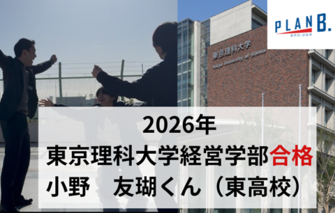 まずは合格おめでとうございます!中学レベルの英語の勉強から始め、市立東高校からMARCH合格本当に嬉しいです!!「法政大学多摩キャンパスが第一志望」と言っていたのに、最終的に明治大学に進学したのは印象的でした。(笑)明治大学に合格したときの感動は今でも忘れません。電話で震えた声で、「先生受かりました」と言ってくレた時の興奮は今でも覚えています。今後は明治大学で思う存分、充実した大学生活を送ってください!
